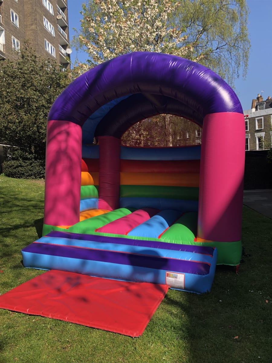 This bouncy castle is suitable for indoor as well as outdoor use. This unit comes with fitted rain cover. This inflatable is suitable for kids up to 12 years of age. The bouncy castle comes with inflation fan, extension cable, anchor stake or sand bags, safety mat.