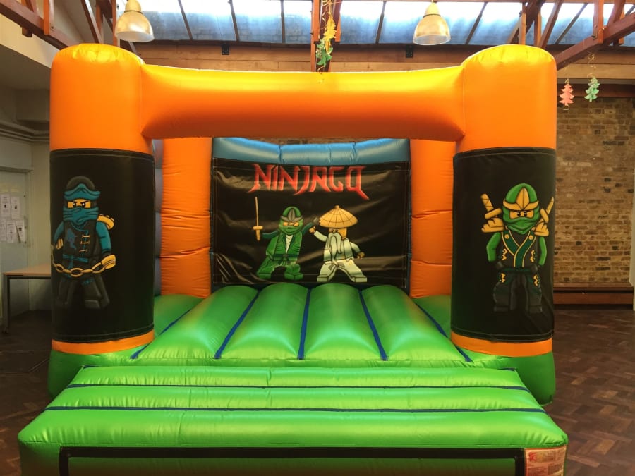 This is an Indoor and outdoor bouncy castle with no shower cover. It is an excellent bouncy castle for Super Heroes themed parties. This unit is suitable for kids up to 12 years of age and will hold 6 to 8 children at any one time depending on age and height. Ninjago bouncy castle in only 9ft high and this makes it perfect for the indoor venues. The inflatable comes with inflation fan, extension cable, anchor stakes or sand bags and with safety mats.